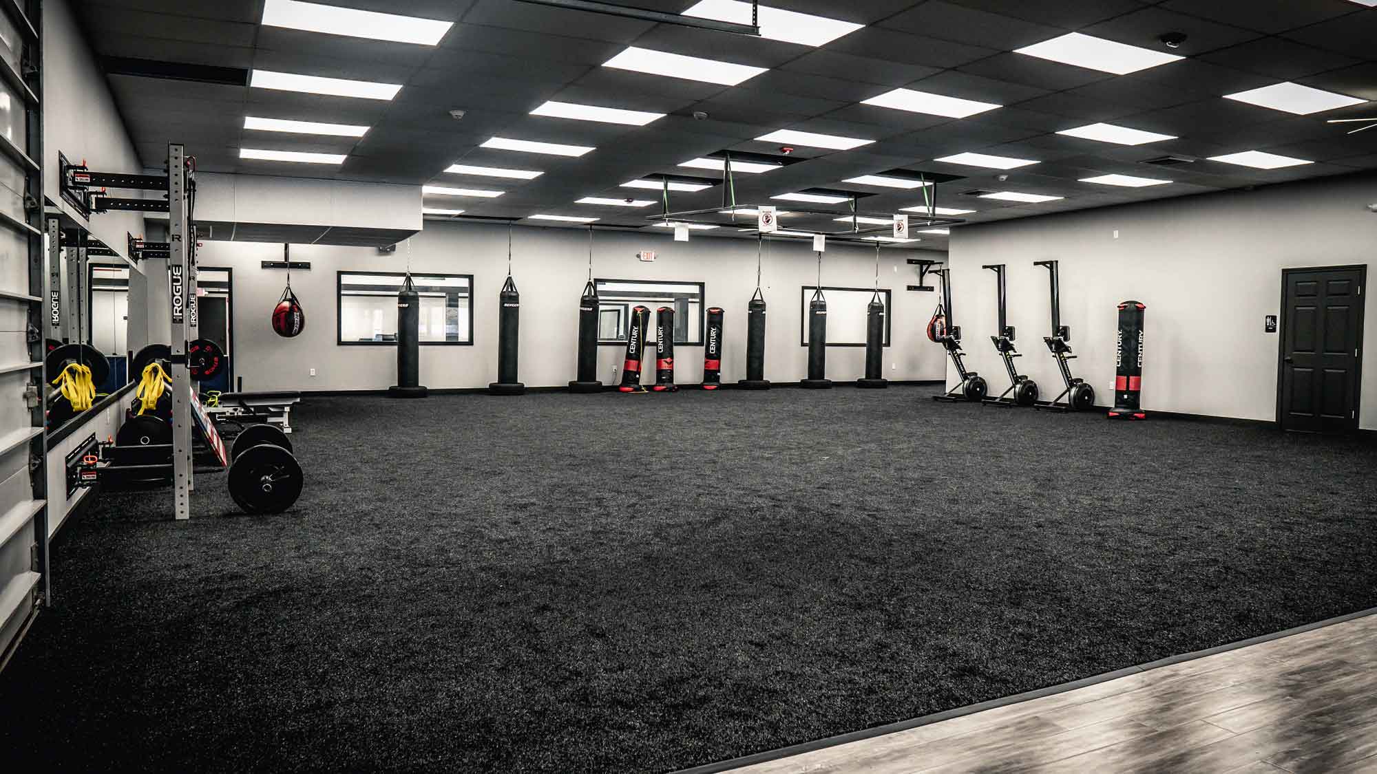 A clean, spacious gym with a full functional weight room and dedicated training areas.